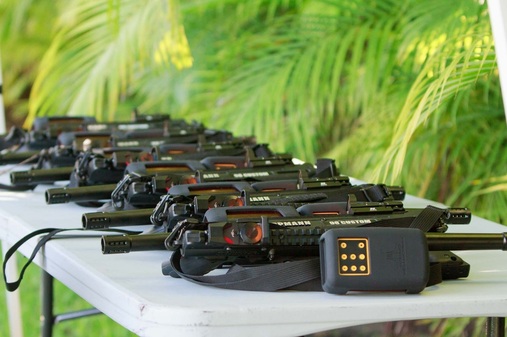 W Mega Campo korzystamy z autentycznych markerów paintballowych, które zostały przystosowane do gry laserowej. Karabinki wyposażone są w emiter podczerwieni zamiast tradycyjnej lufy, odbiornik z wyświetlaczem oraz sygnalizacją świetlno–dźwiękową, a także system Barracuda zwiększający precyzję strzałów. Zasilanie sprężonym powietrzem sprawia, że czucie karabinka jest zbliżone do klasycznego paintballa klasycznego, ale bez efektów uderzenia kulki.